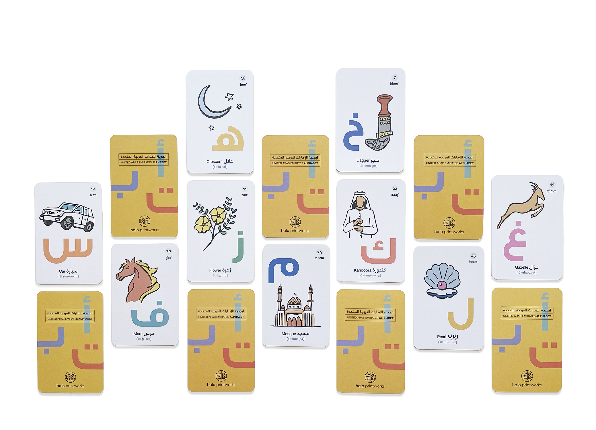 Inspired by the UAE landscape and culture, this Arabic alphabet print and flashcard deck Combo brings fun and joy into your kid’s learning journey. You will have a blast singing the letters while associating them with the visuals. The print is a beautiful piece to hang in your child’s bedroom or nursery, while the flashcards are the way to learn on the go!